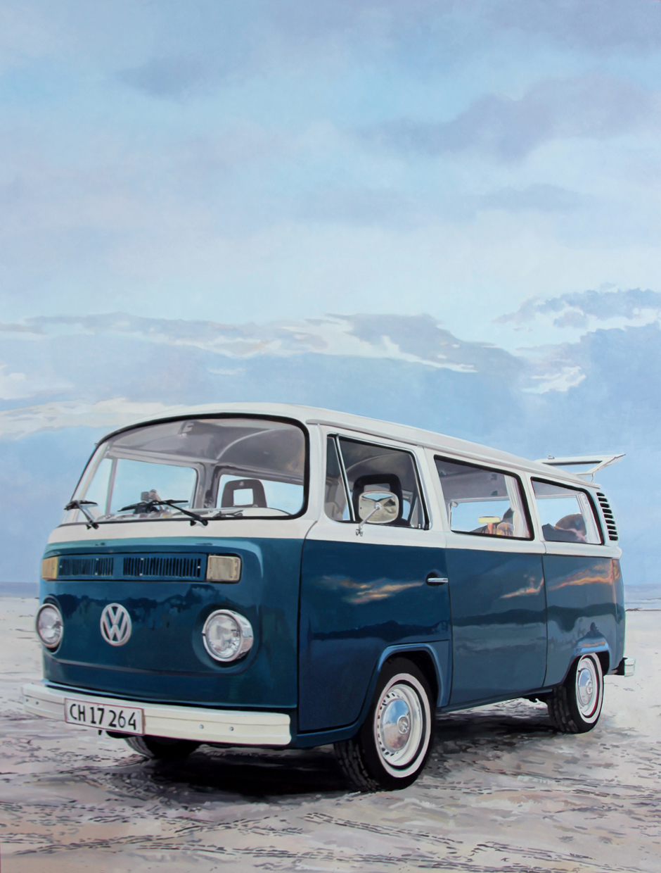 VW T2 am Vejers Strand, Öl auf Pappe, lackiert, 65 x 50 cm, 2025