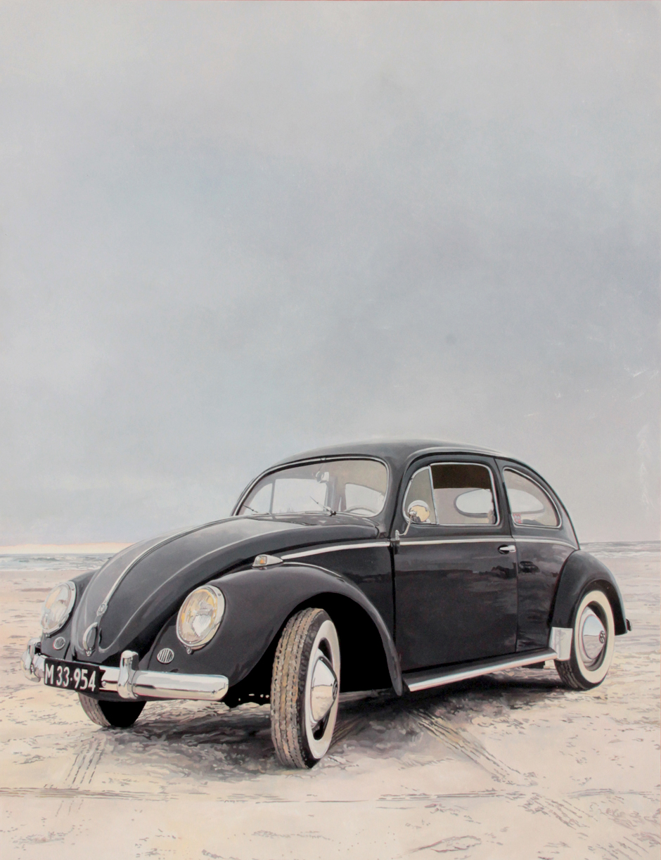 VW Käfer schwarz am Vejers Strand, Öl auf Pappe, lackiert, 65 x 50 cm, 2025